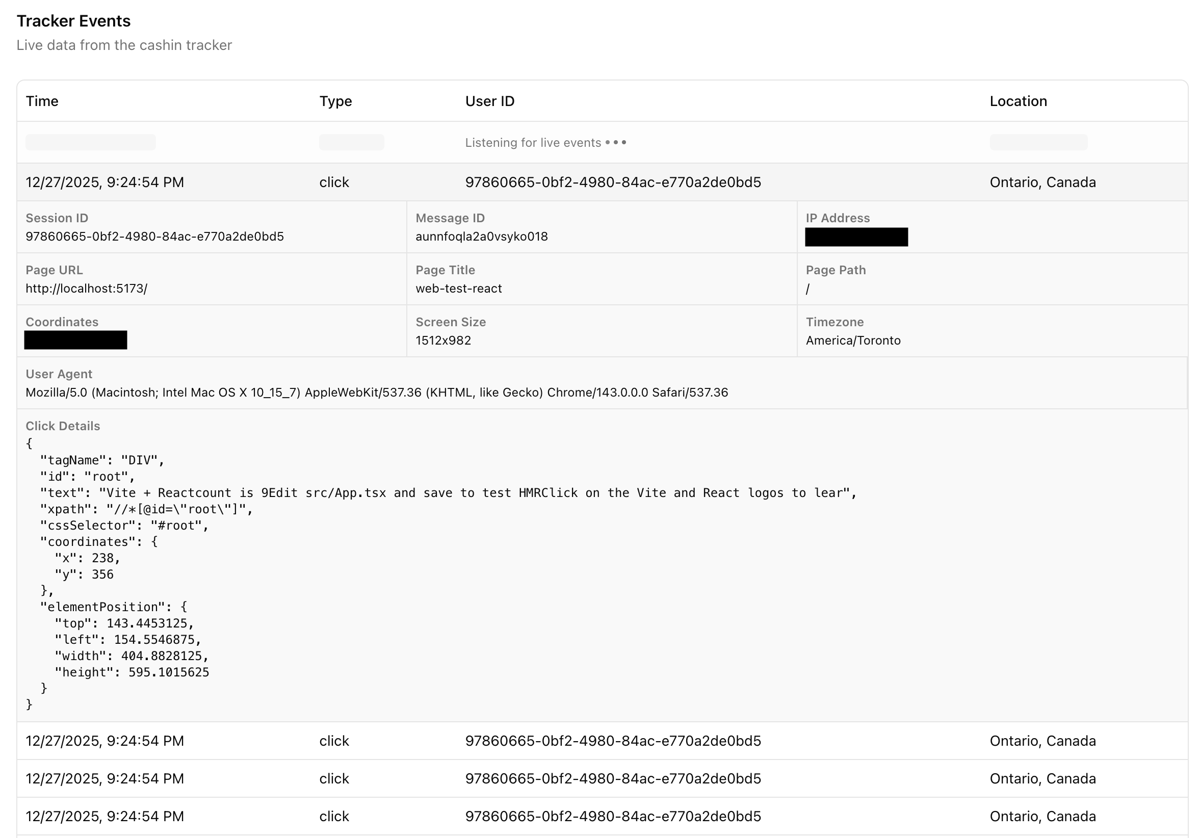 Check the tracking dashboard to see live events appearing. You should see page views and any tracked events.
